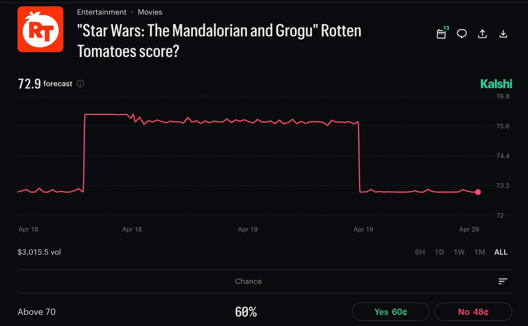 And we do all of this because there is, of course, a market for the Rotten Tomatoes score for The Mandalorian and Grogu, set to be released in theaters on May 22\. Kalshi has “above 75” as about a 50/50 shot \(“yes” is 52¢\) and has it forecast for a 72\.9 at the moment: