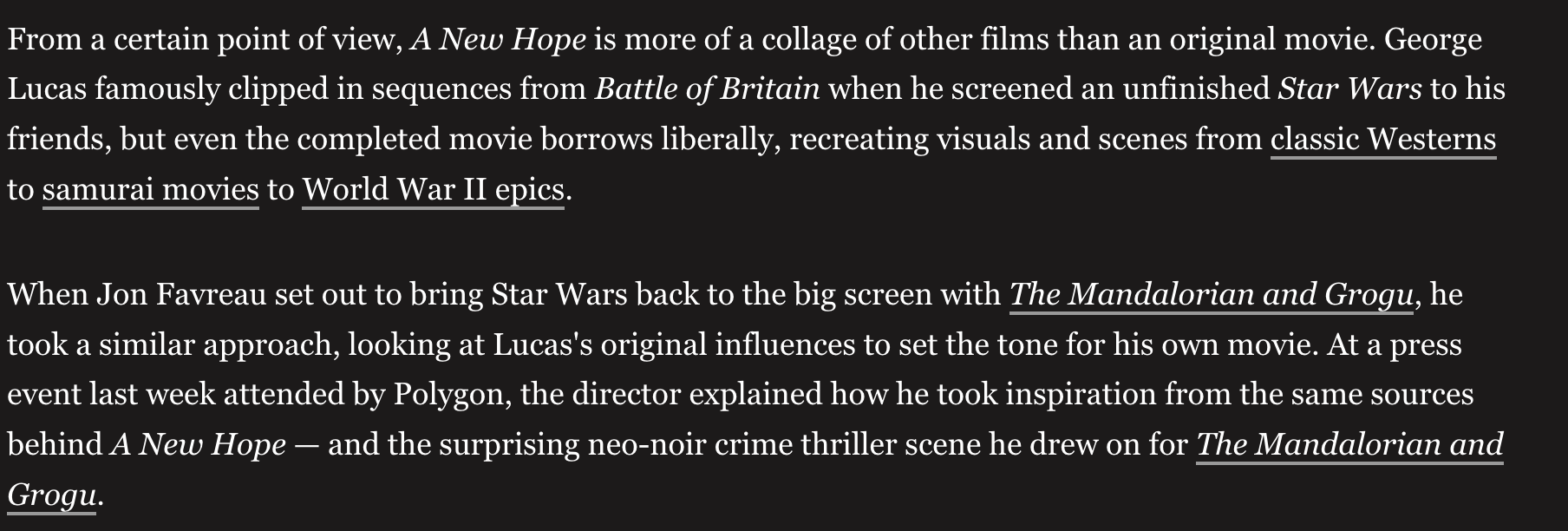 But Kleinman’s “meh” review of the first 15 minutes could still turn into a “good” Tomatometer review if he even gives it 3/5 stars\. Plus, his review got me clicking over to a Jon Favreau \(the writer and director\) interview where he talked about The Mandalorian and Grogu’s influences and its immersion into the original Star Wars feel\. He has a line in here — “so, we’re all playing the same music,” — that implies he took extra care to not just replicate the original Star Wars feel, but to break down what made the original trilogy special in the first place \(Flash Gordon pulp, Kurosawa storytelling, family themes, etc\) to recreate that vibe\. He’s not just paying homage, he’s sourcing the same ingredients: