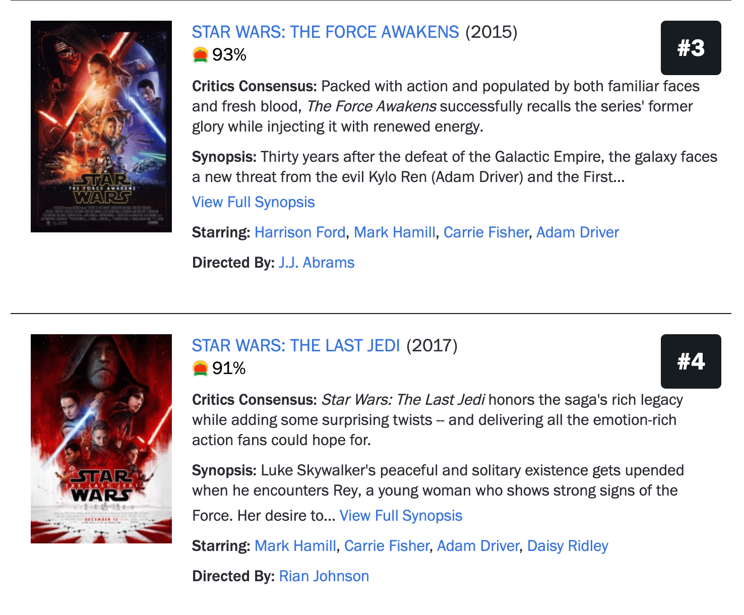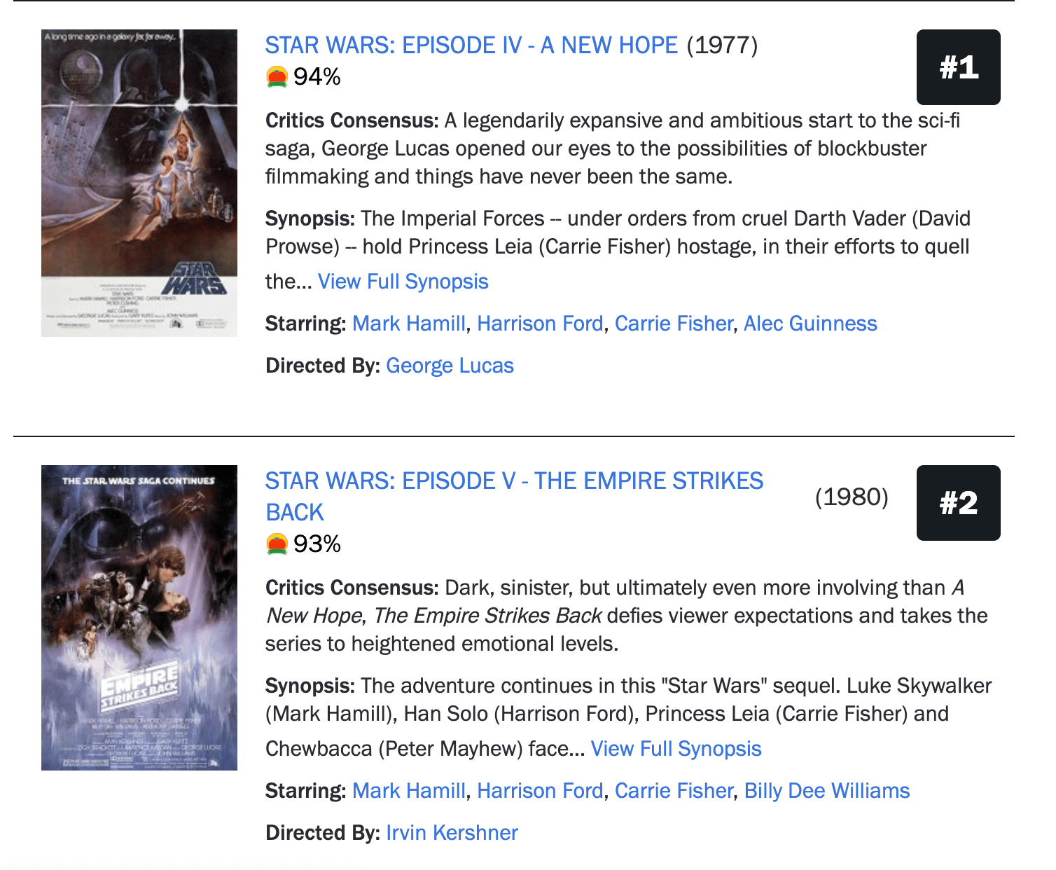 As for the deeper dive, I went back and looked at past Star Wars movies and how they’ve rated on the Tomatometer\. There were four that landed above 90\. And I dare you to guess all four, because you will not\. The first two are obvious: