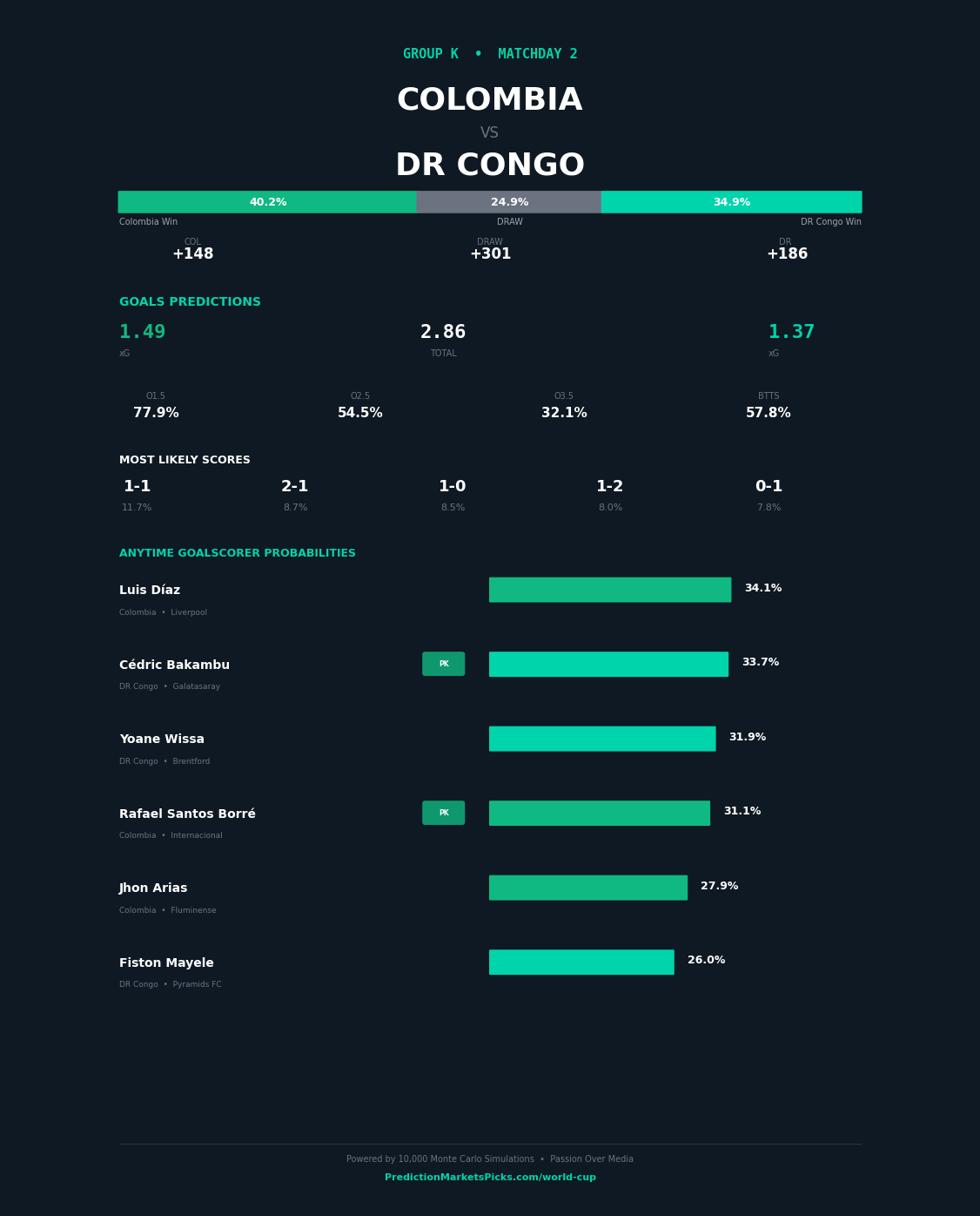 Colombia and DR Congo meet in Group K at the 2026 FIFA World Cup on 2026-06-20 at Levi's Stadium, Santa Clara. Our simulation gives Colombia a clear edge — a 19-point win probability gap separating these sides. Colombia enters with a 93.8% advancement probability in our model vs DR Congo at 33.9%. The Over 2.5 goals is our primary market play. The combined attacking profiles of these sides project to a high-scoring affair. Top value play: Colombia to win.