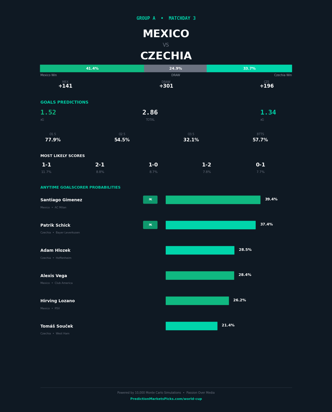 Mexico and Czechia meet in Group A at the 2026 FIFA World Cup on 2026-06-23 at Estadio BBVA, Monterrey. Our simulation gives Mexico a clear edge — a 13-point win probability gap separating these sides. Mexico enters with a 94.1% advancement probability in our model vs Czechia at 62%. The Over 2.5 goals is our primary market play. The combined attacking profiles of these sides project to a high-scoring affair. Top value play: Mexico to win.