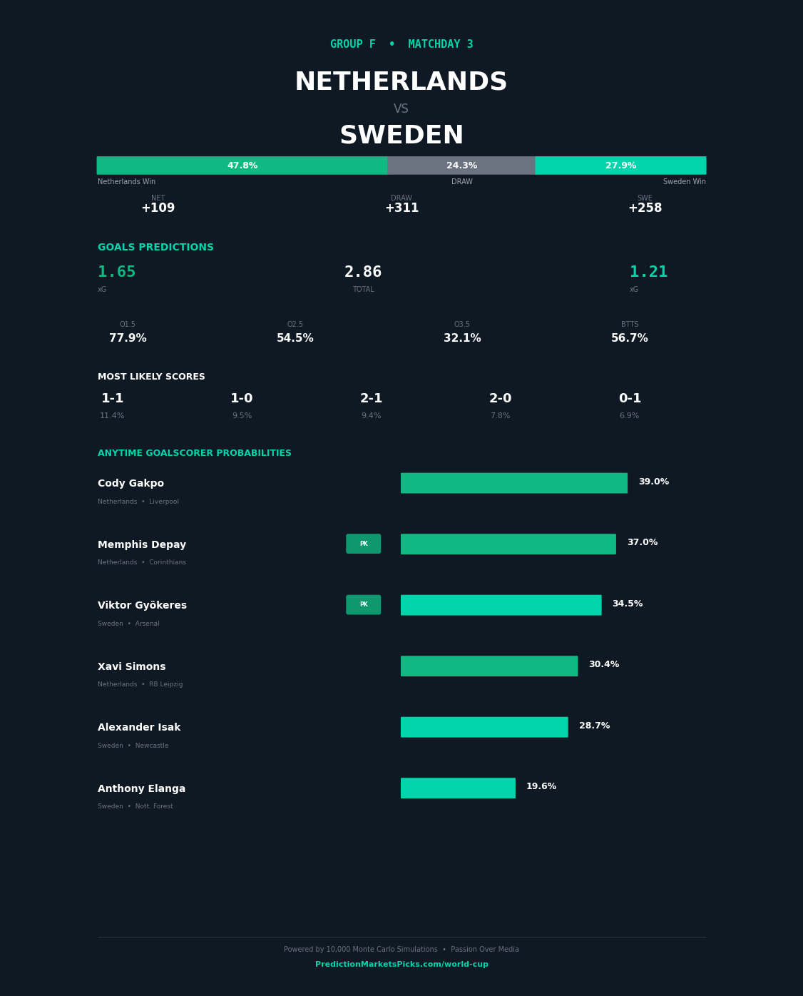 Netherlands and Sweden meet in Group F at the 2026 FIFA World Cup on 2026-06-24 at Lumen Field, Seattle. This is one of the tighter matches in Group F. The simulation sees these teams as closely matched, with just a 9-point spread. Netherlands enters with a 95.3% advancement probability in our model vs Sweden at 49.1%. The Over 2.5 goals is our primary market play. The combined attacking profiles of these sides project to a high-scoring affair. Top value play: Netherlands to win.