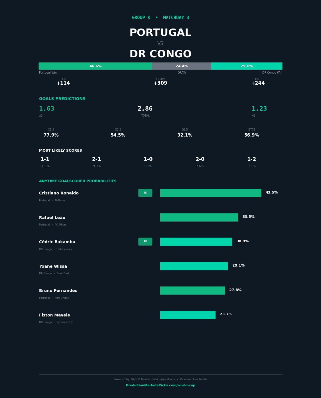 Portugal and DR Congo meet in Group K at the 2026 FIFA World Cup on 2026-06-25 at Lumen Field, Seattle. Our simulation gives Portugal a clear edge — a 29-point win probability gap separating these sides. Portugal enters with a 98.7% advancement probability in our model vs DR Congo at 33.9%. The Over 2.5 goals is our primary market play. The combined attacking profiles of these sides project to a high-scoring affair. Top value play: Ronaldo anytime scorer.