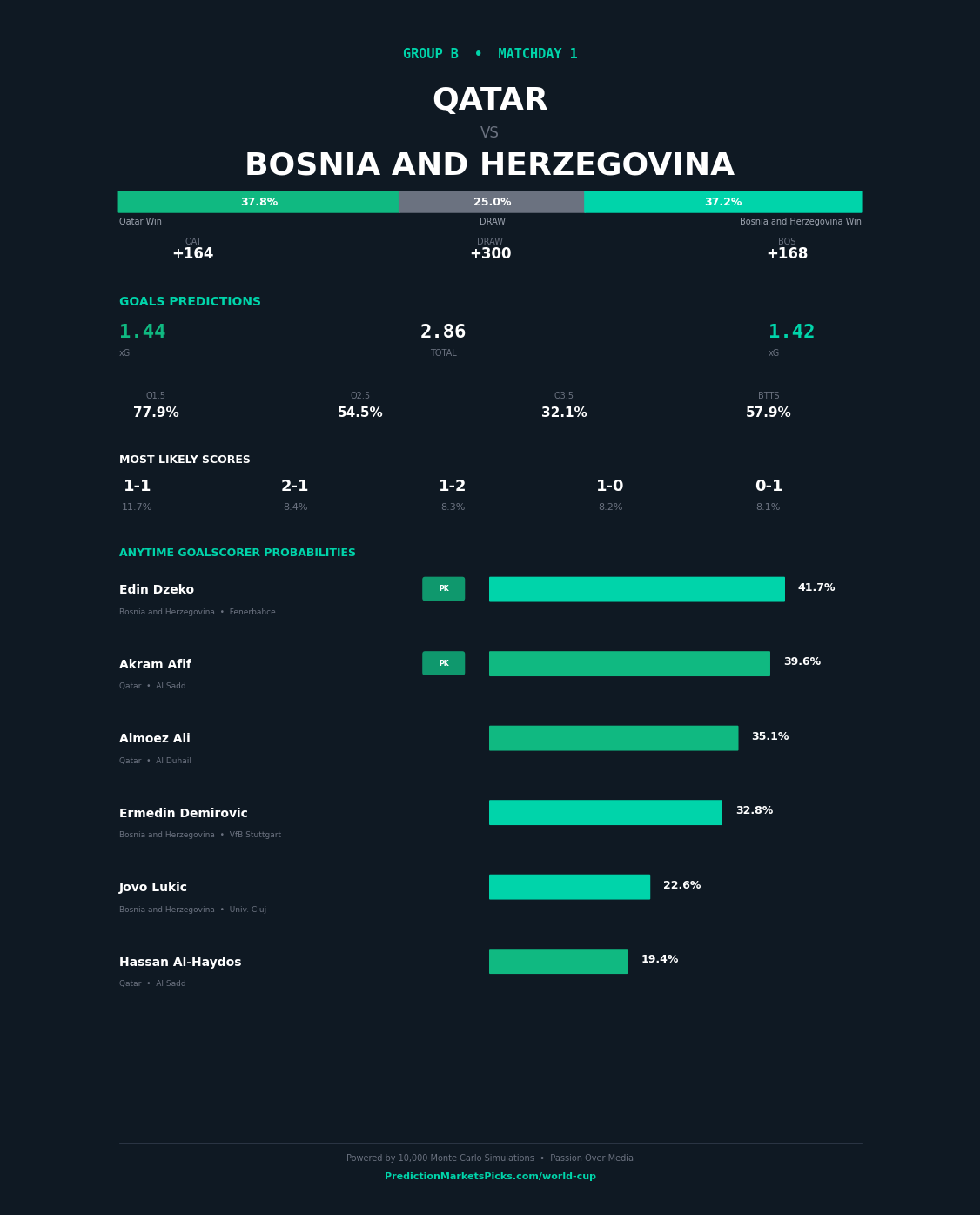 Qatar and Bosnia & Herzegovina meet in Group B at the 2026 FIFA World Cup on 2026-06-12 at MetLife Stadium, East Rutherford. Our simulation gives Bosnia & Herzegovina a clear edge — a 13-point win probability gap separating these sides. This shapes up as a tighter, lower-scoring contest. Under 2.5 goals is the lean based on defensive profiles and group stage conservative tactics. Top value play: Dzeko anytime scorer.