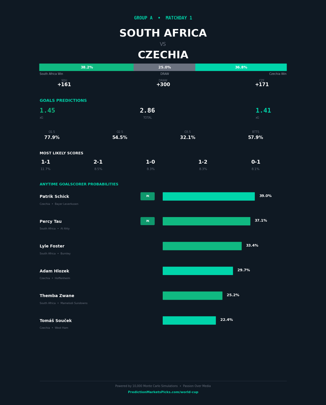 South Africa and Czechia meet in Group A at the 2026 FIFA World Cup on 2026-06-12 at Estadio BBVA, Monterrey. This is one of the tighter matches in Group A. The simulation sees these teams as closely matched, with just a 7-point spread. South Africa enters with a 40.1% advancement probability in our model vs Czechia at 62%. This shapes up as a tighter, lower-scoring contest. Under 2.5 goals is the lean based on defensive profiles and group stage conservative tactics. Top value play: Schick anytime scorer.