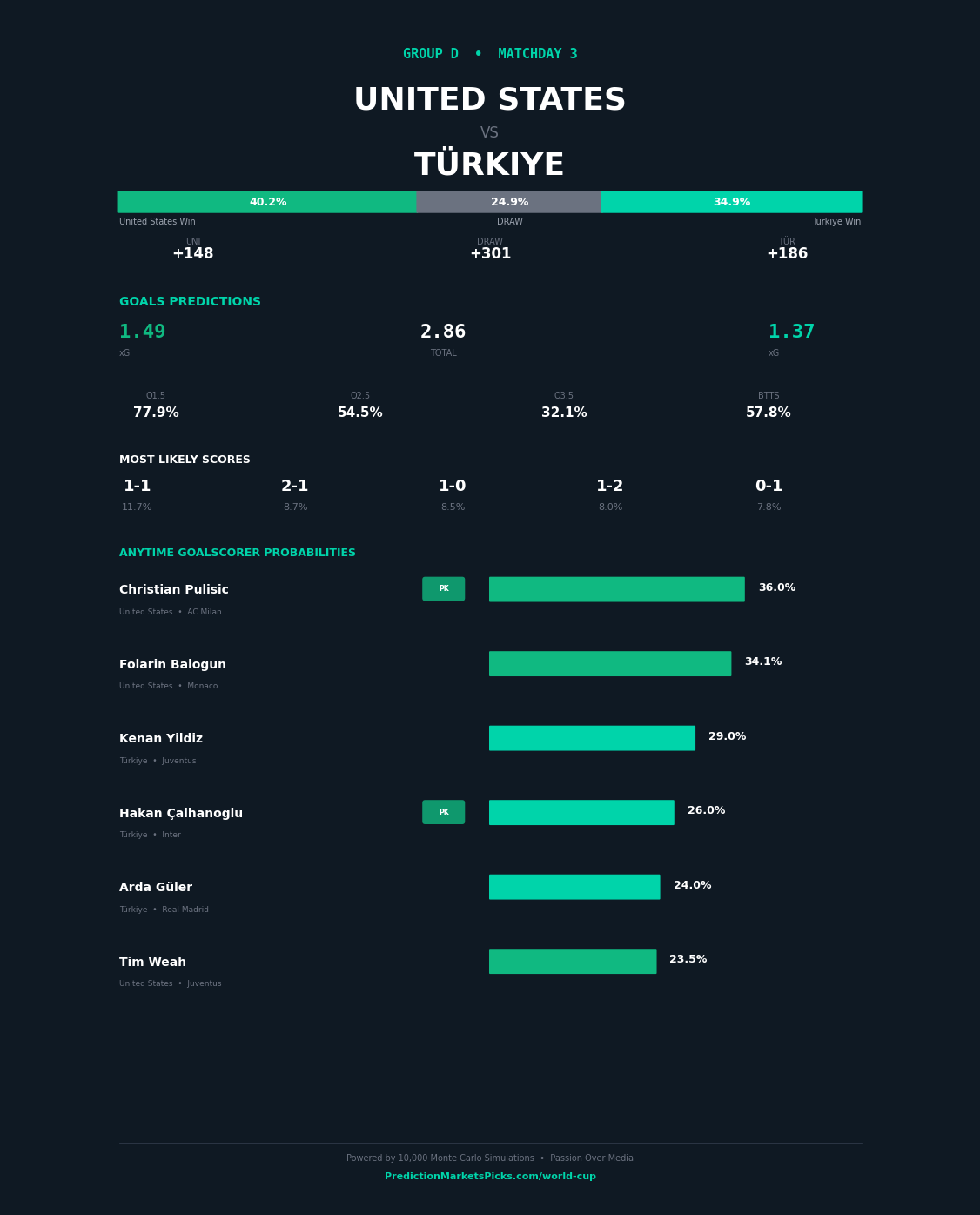United States and Türkiye meet in Group D at the 2026 FIFA World Cup on 2026-06-24 at AT&T Stadium, Dallas. This is one of the tighter matches in Group D. The simulation sees these teams as closely matched, with just a 9-point spread. United States enters with a 88.5% advancement probability in our model vs Türkiye at 70.1%. The Over 2.5 goals is our primary market play. The combined attacking profiles of these sides project to a high-scoring affair. Top value play: USA to win.